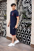 This men's short set is crafted from comfortable cotton fabric, perfect for keeping you cool during the summer months. The set features a classic navy top with contrasting red pocket details for a touch of sporty flair. The ribbed detailing, also in red, adds a subtle textural element and complements the pockets.